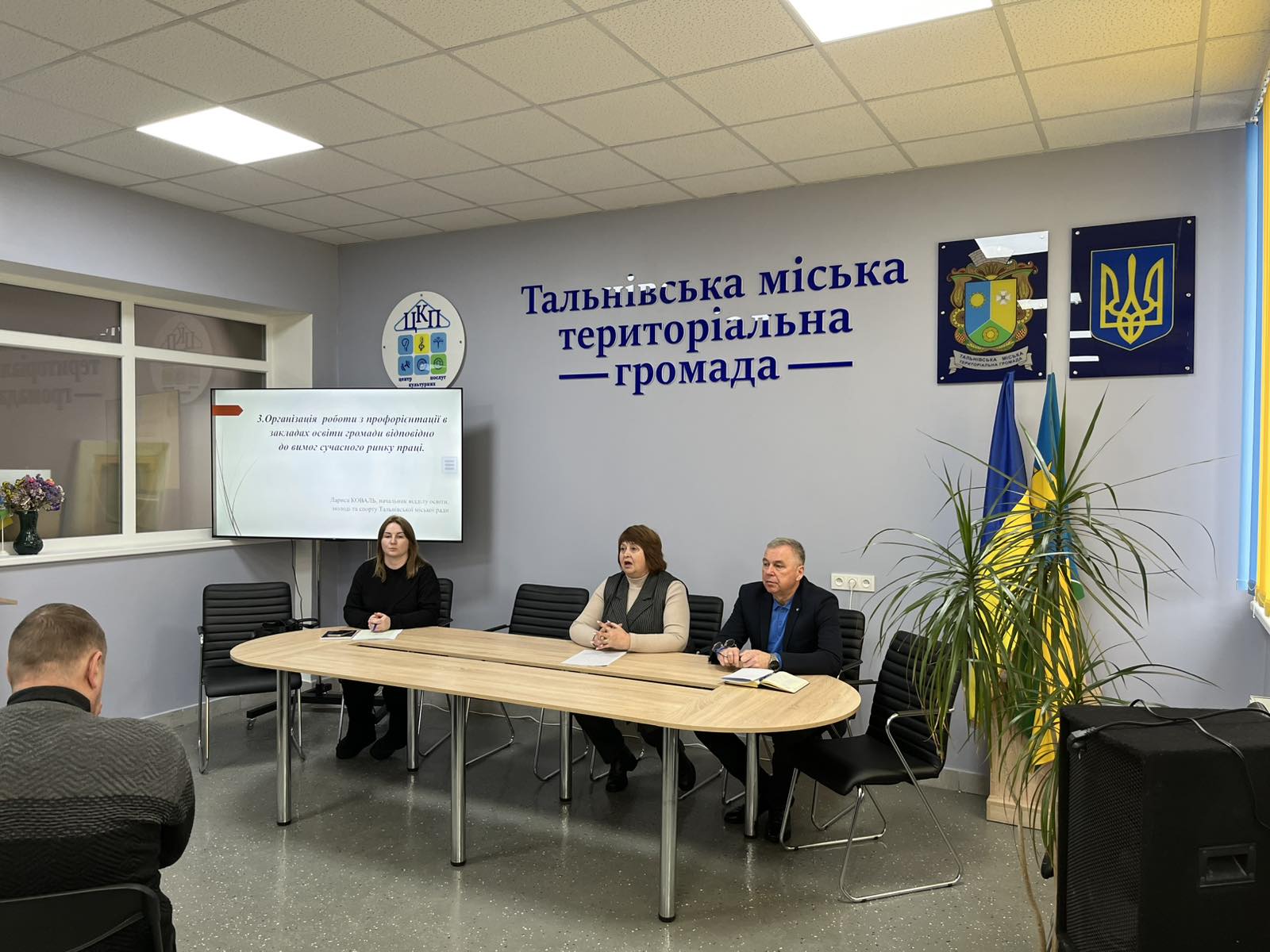 Начальник відділу освіти, молоді та спорту Лариса Коваль сказала, що організація профорієнтаційної роботи в закладах освіти громади – це системний процес, що поєднує шкільні заходи (тренінги, екскурсії, консультування), співпрацю з Тальнівським управлінням Звенигородської філії Черкаського обласного центру зайнятості, закладами вищої освіти, роботодавцями та залученням батьків. Зазначена діяльність спрямована на допомогу учням у виборі майбутньої професії через діагностику, ознайомлення зі світом праці та формування свідомого самовизначення, що вимагає планування, координації та використання різноманітних форм та методів роботи. У рамках пілотування заплановане налагодження співпраці шкіл з бізнесом, професійними та фаховими коледжами для проведення профорієнтаційних екскурсій, стажування на підприємствах та спільних профорієнтаційних заходів; також впровадження профорієнтаційного курсу за вибором «Навчання з професійної орієнтації у школах» у 8 та 9 класах для учнів та учениць шкіл, щоб допомогти їм зробити усвідомлений вибір майбутньої професії. Педагоги громади стануть учасниками програми підготовки кар’єрних радників для шкіл, що розроблена Цюрихським педагогічним університетом (Швейцарія).