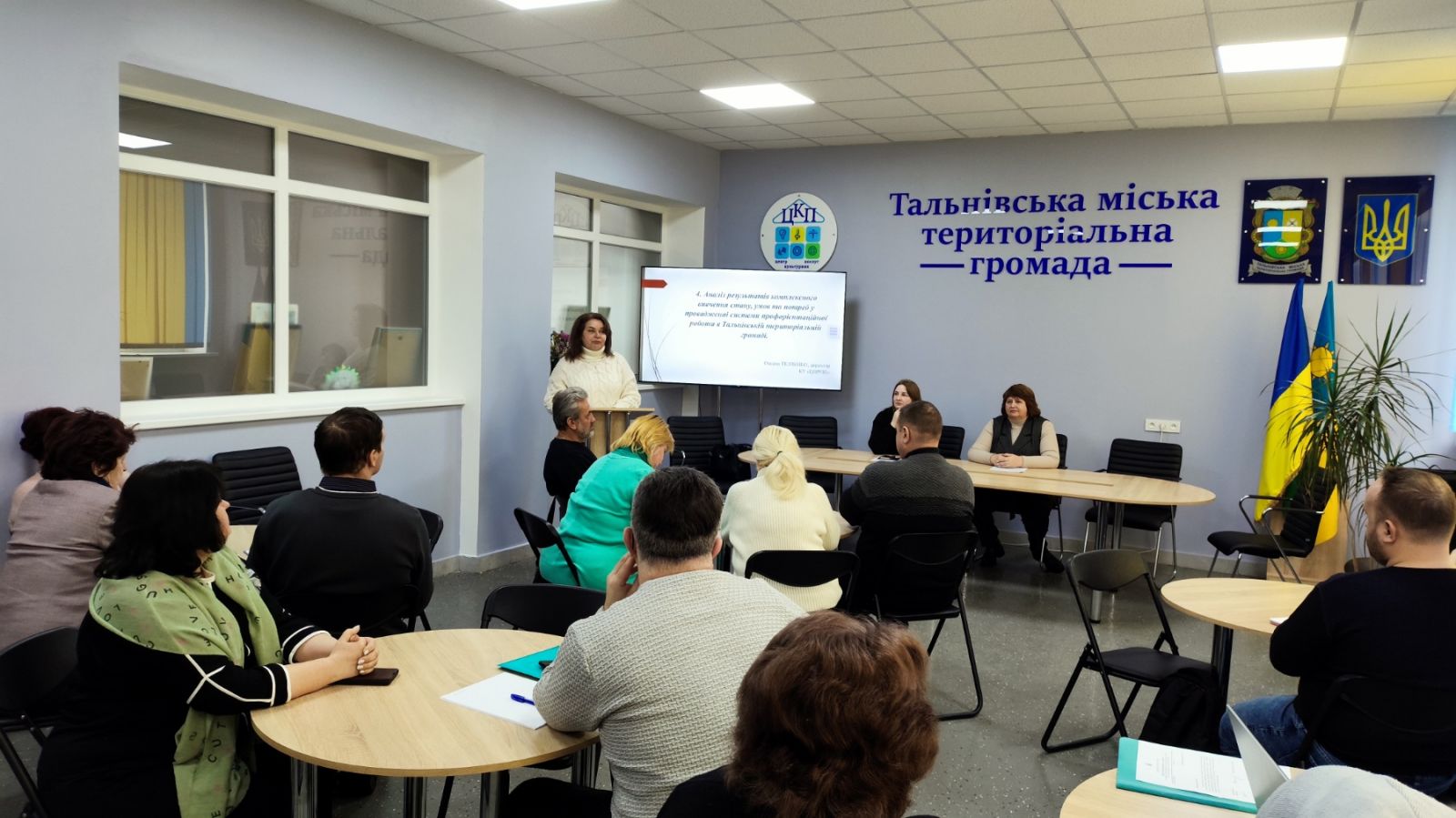 Координатор проекту у громаді, директор КУ «ЦПРПП» Оксана Ткаченко презентувала Аналіз результатів комплексного вивчення стану, умов та потреб у провадженні системи профорієнтаційної роботи в Тальнівській територіальній громаді.